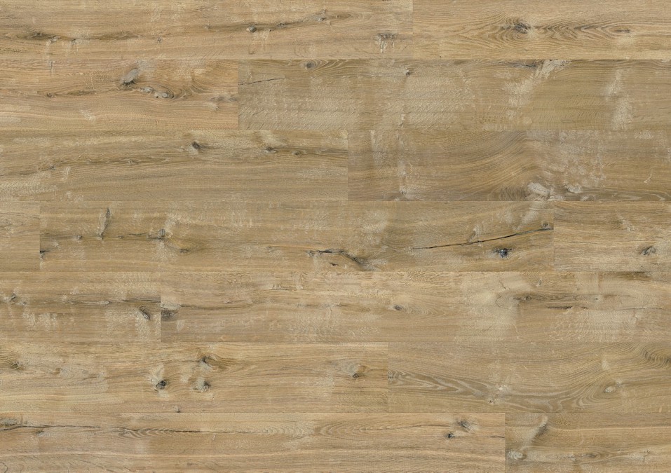 Le stratifié Chêne Blond séduit par sa teinte brune et son décor riche en détails, où les nœuds, fissures et marques du bois sont subtilement reproduits. Ce rendu volontairement vieilli confère à chaque lame un cachet unique et authentique, rappelant le charme des vieux planchers en chêne massif.