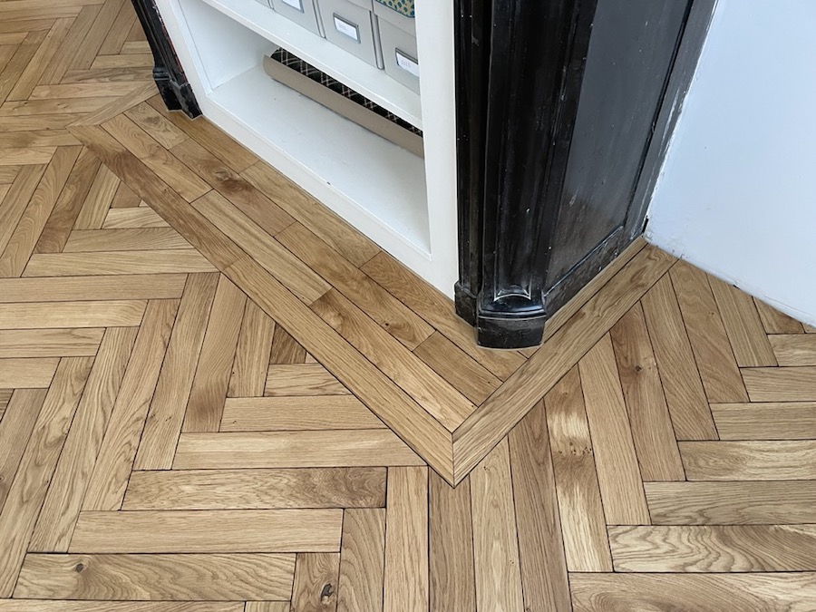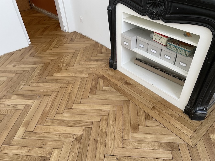 Magnifique que cette pose de parquet vieilli à la main en motif point de hongrie.