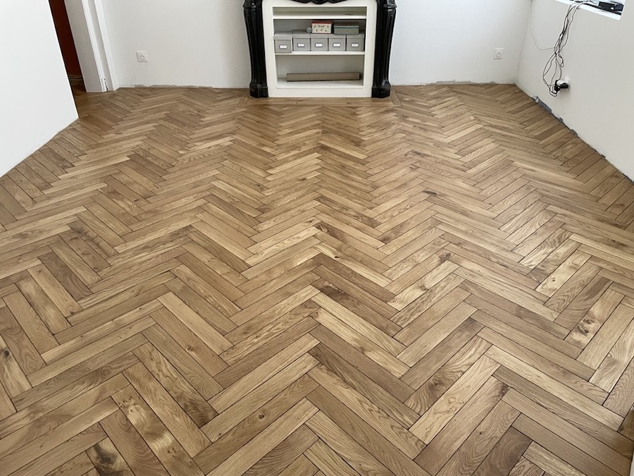 Parquet massif vernis mat, bâton rompu, Origine FRANCE, vieilli, chants brûlés