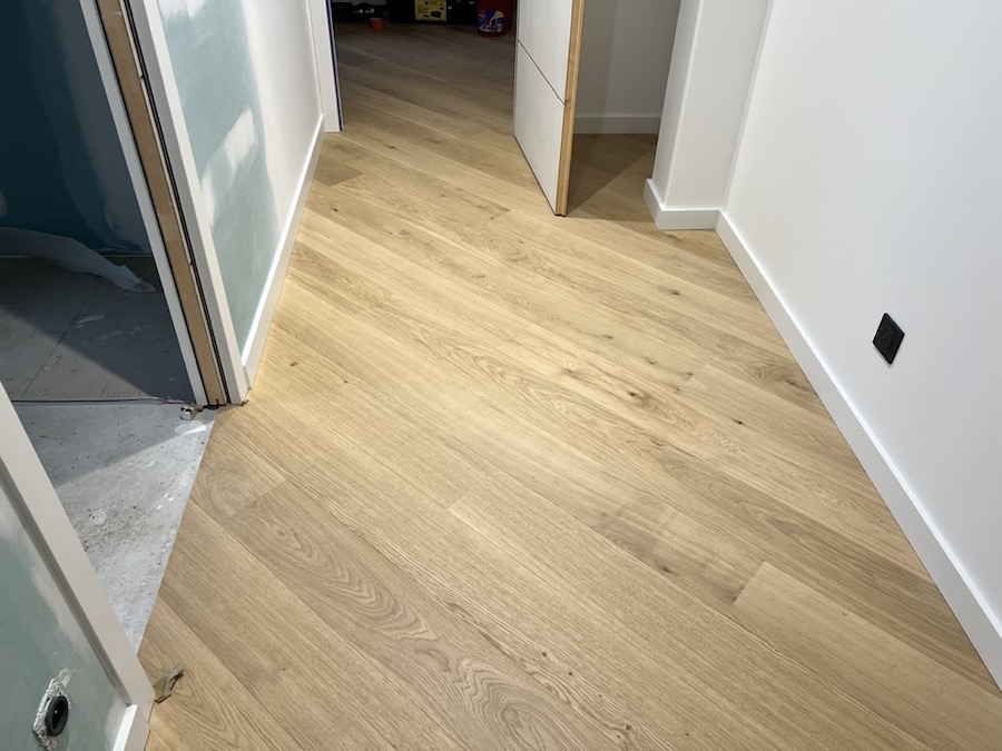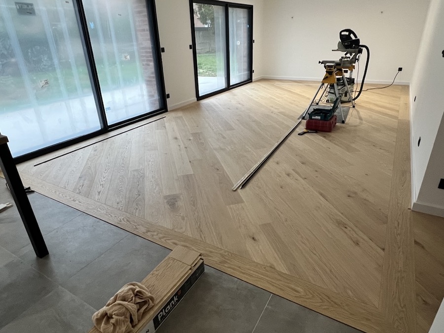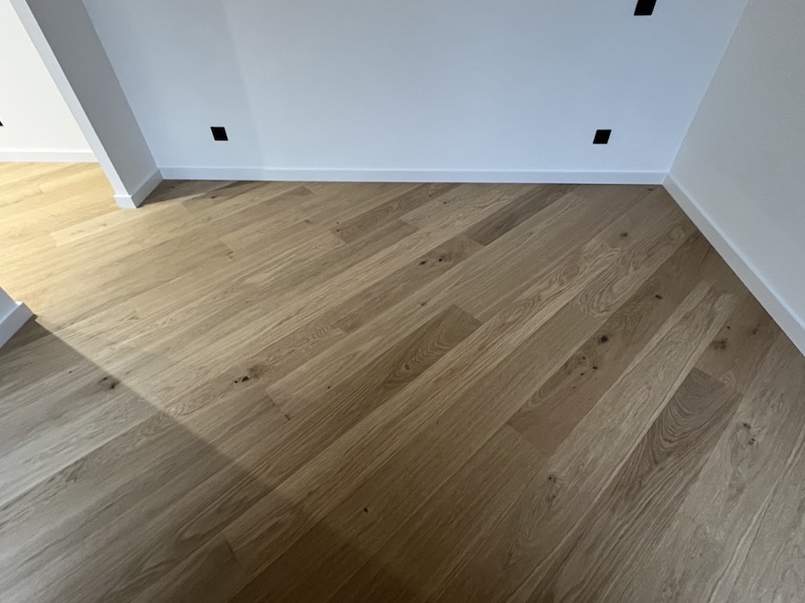 Pour cette nouvelle réalisation, nos clients souhaitaient apporter chaleur et authenticité à leur rez-de-chaussée. Le choix s'est porté sur un parquet contrecollé en chêne "Animoso Authentic 181", un sol huilé à l'aspect bois brut, doté de deux chanfreins sur la longueur.