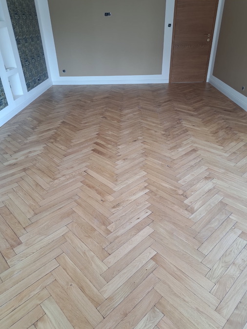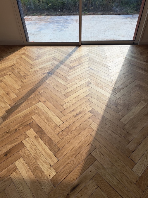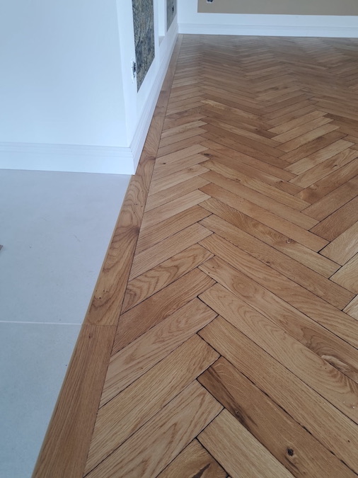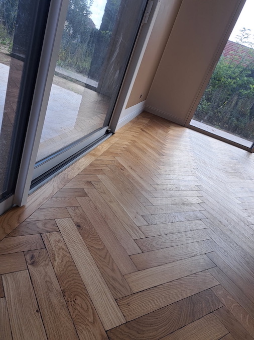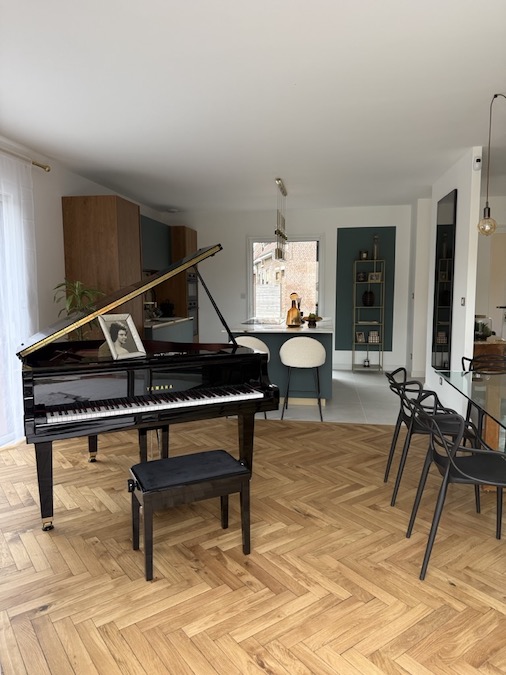 La pose en bâton rompu apporte élégance et caractère à l'espace. Une ceinture a été réalisée tout autour de la pièce, assurant une finition soignée et une transition harmonieuse avec la cuisine ouverte.