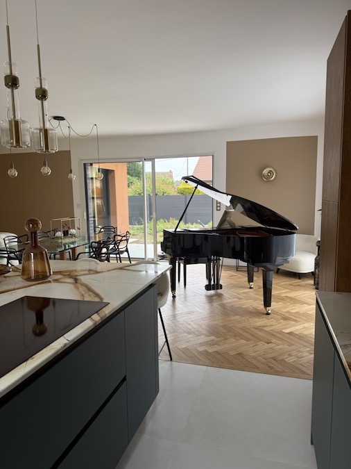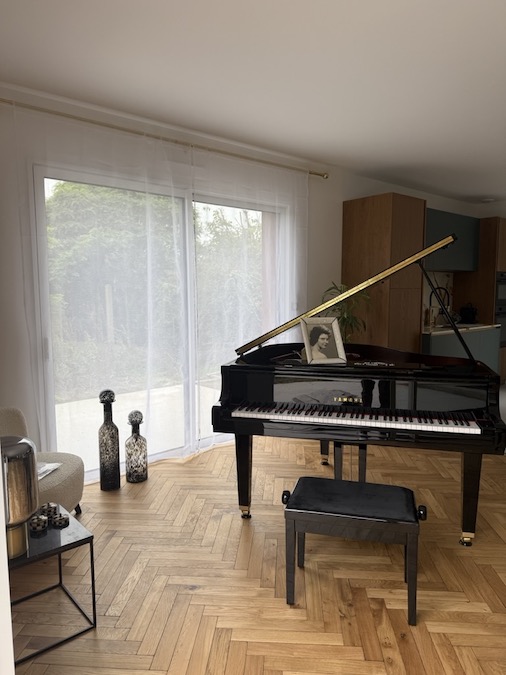 Le parquet s'intègre parfaitement à la décoration moderne du séjour : murs blancs, touches de beige, éléments noirs, verre… le tout sublimé par un magnifique piano qui trône au cœur de la pièce.