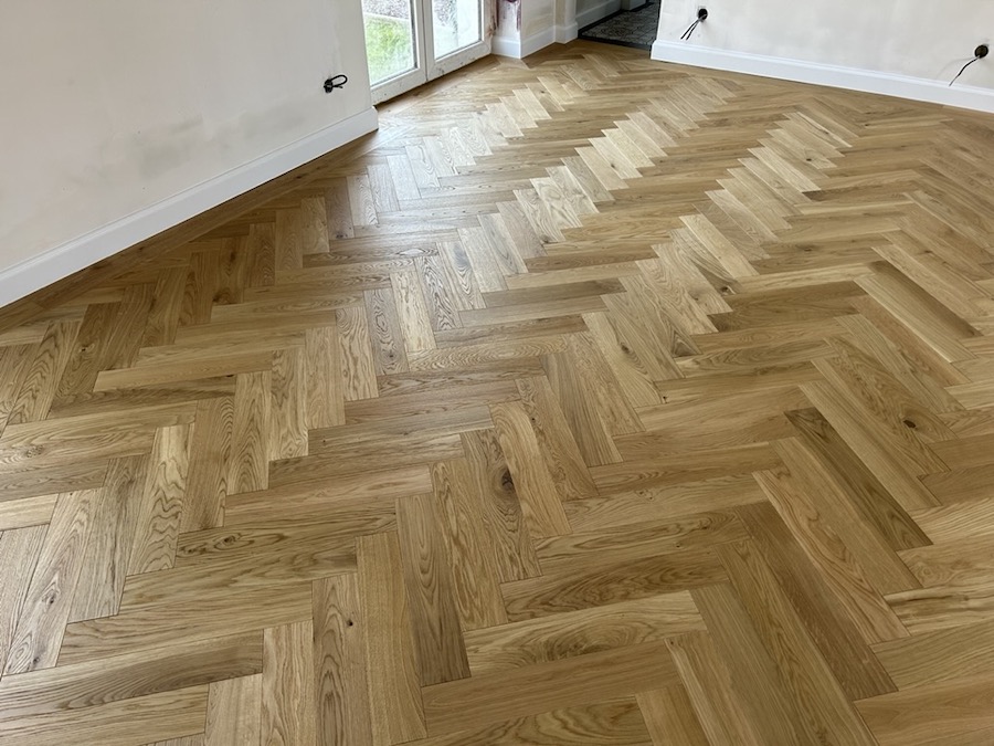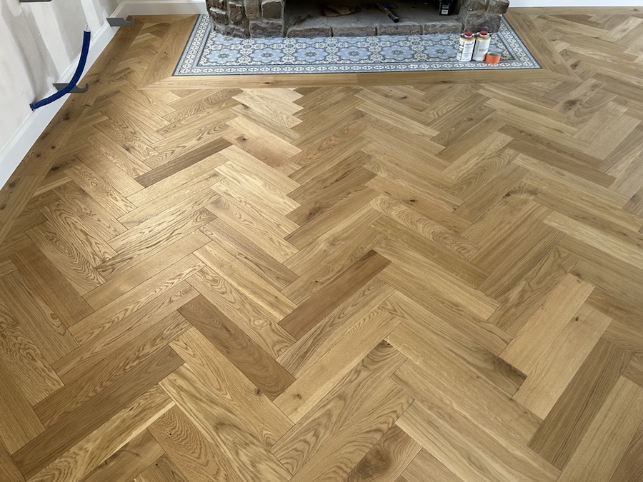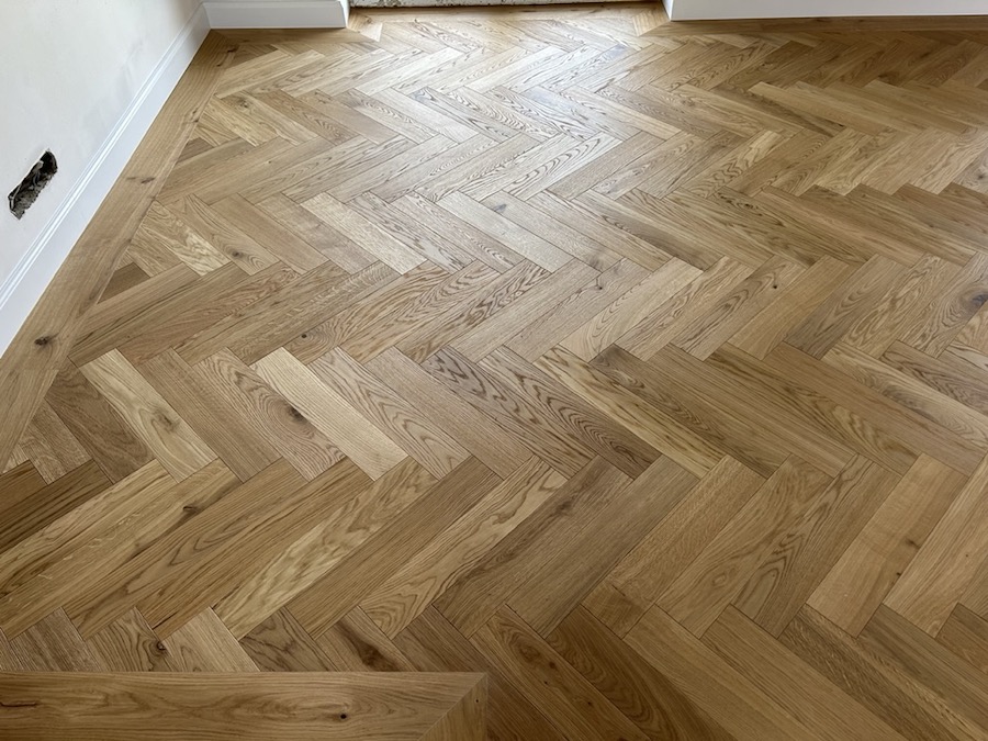 Ils ont choisi un parquet contrecollé en chêne brossé huilé naturel, posé en bâton rompu, un motif intemporel qui apporte élégance et mouvement à la pièce.