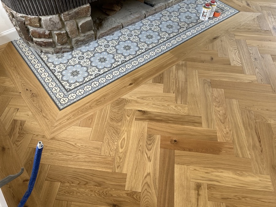 Pour sublimer l'ensemble, nos équipes ont réalisé une ceinture en lames droites tout autour de la pièce. Cette finition élégante permet une transition harmonieuse avec les carreaux de ciment présents autour de la cheminée et dans la cuisine — un contraste réussi entre tradition et modernité.