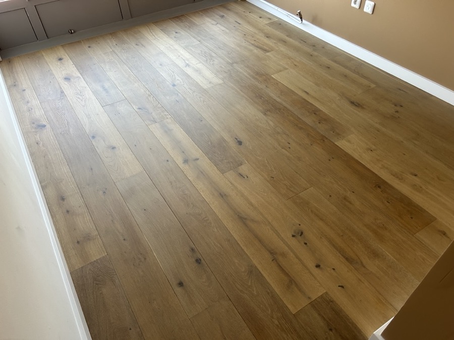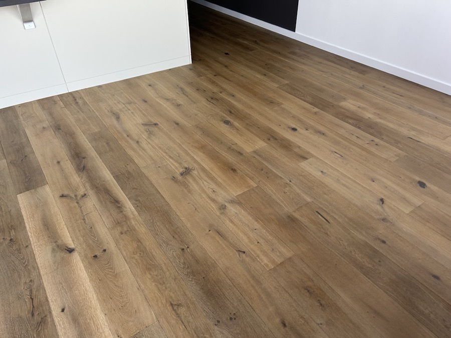 Après un passage dans notre magasin d'Englos, nos clients ont fait le choix d'un parquet semi-massif en chêne COGNAC BROWN, choix fermette. Ce choix dit fermette se distingue par la présence de noeuds et d'irrégularités naturelles, qui apportent beaucoup de caractère et un rendu authentique.