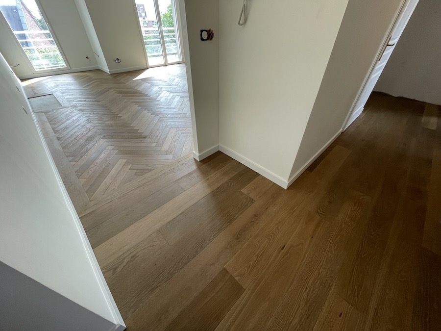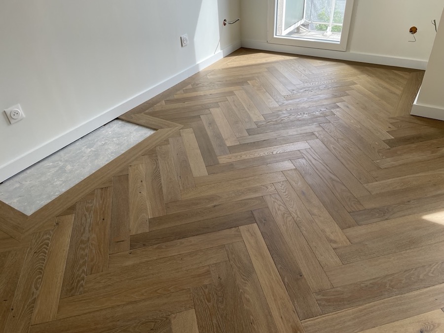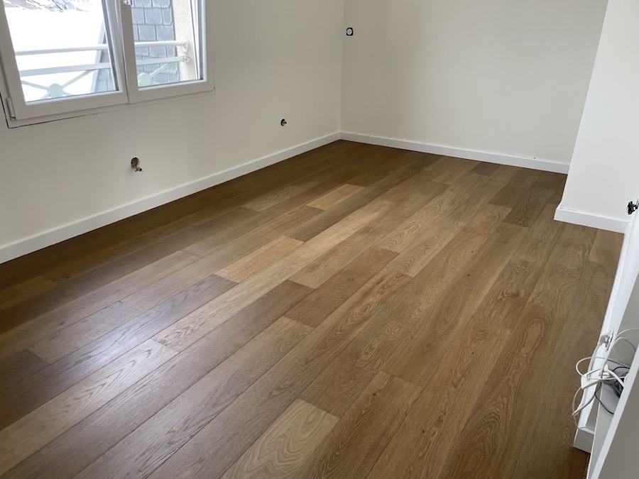 Dans la pièce de vie (séjour / salle à manger), le parquet a été posé en bâton rompu, avec une ceinture an lames droites sur le pourtour de la pièce. Ce choix de pose met en valeur les volumes et la luminosité, notamment grâce aux grandes ouvertures qui laissent entrer généreusement la lumière naturelle. Les murs et les plinthes blancs viennent sublimer la teinte du parquet et créer un contraste à la fois doux et contemporain.