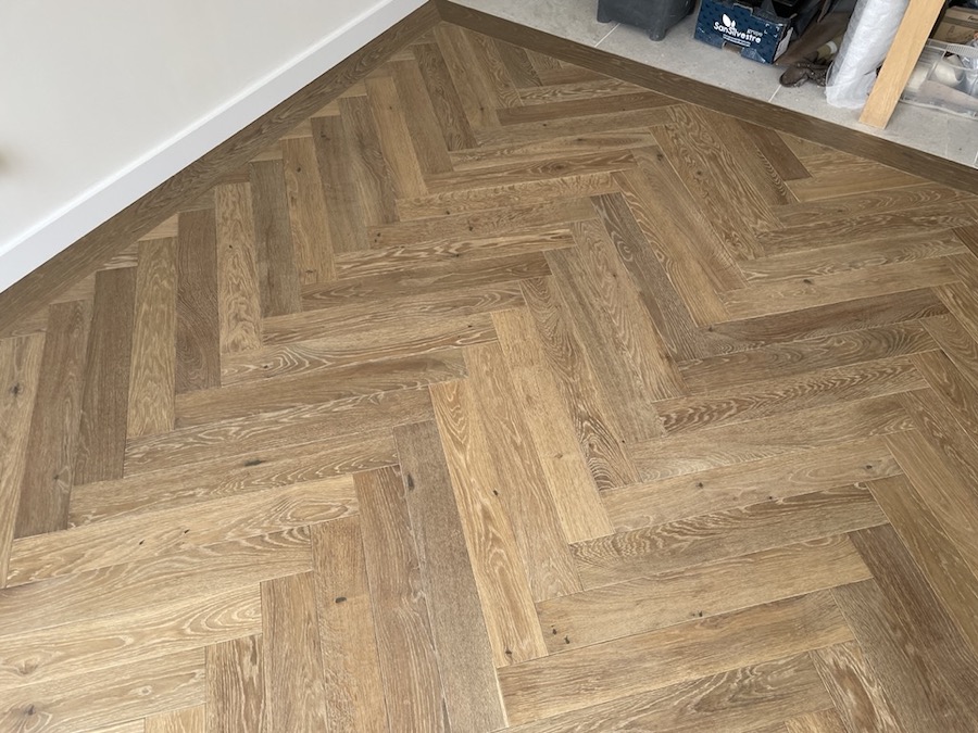 Nos clients ont fait le choix d'un parquet contrecollé, semi-massif huilé, dans une teinte COGNAC BROWN : une nuance chaleureuse et légèrement foncée, qui apporte élégance et caractère à l'espace. Le bois sélectionné est un choix Noblesse, c'est à dire sans noeuds, pour un rendu particulièrement raffiné et homogène.