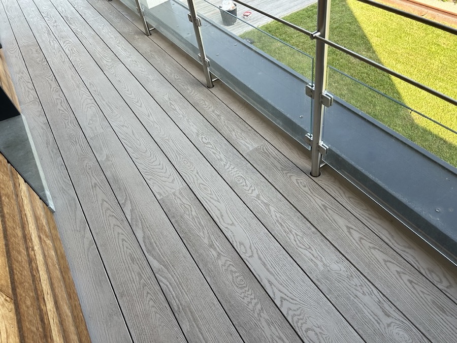 Associée au garde-corps en aluminium moderne, cette finition crée un ensemble harmonieux, lumineux et contemporain. Le rendu met en valeur l'espace extérieur tout en lui apportant une vraie sensation de chaleur et de confort.
