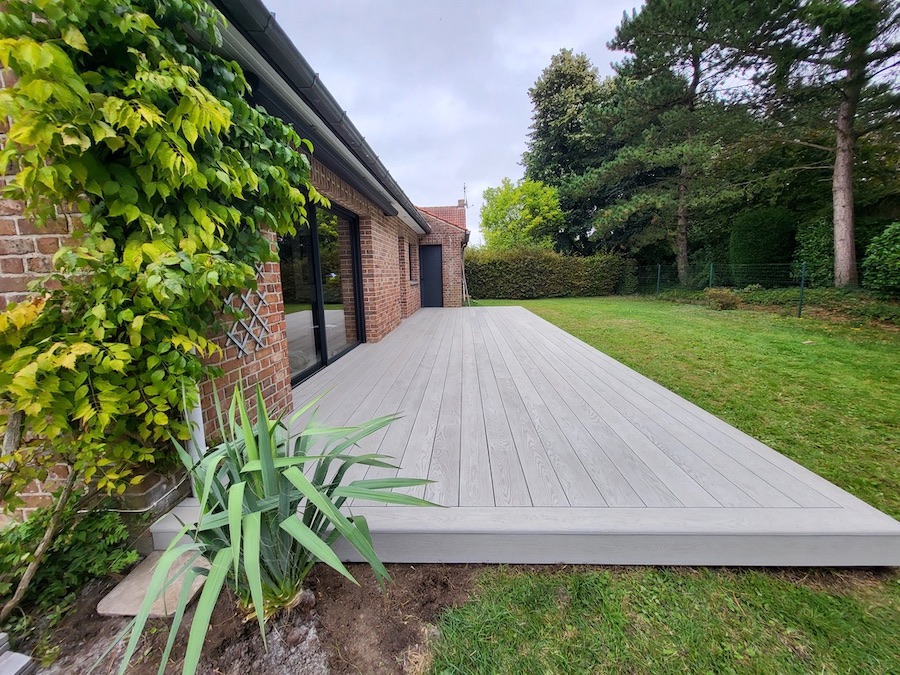 Adaptée au climat parfois exigeant des Hauts de France, la résine minérale résiste aux intempéries et aux rayons UV. Contrairement aux terrasses en bois exotique qui grisent et demandent un entretien régulier, cette terrasse garde son aspect d'origine : sa teinte est déjà grisée et ne subira pas de décolorations. Elle se distingue aussi par sa grande facilité d'entretien, idéale pour profiter pleinement de son jardin sans contrainte.